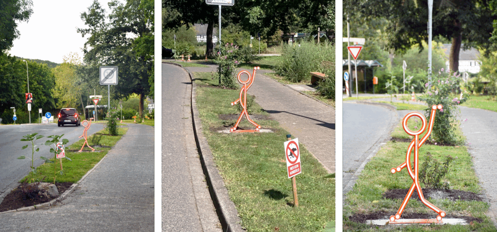 Die Stadt Lohmar hat die stilisierte Figur der Firma PIETO® pünktlich vor Schulbeginn auf einer städtischen Grünfläche installiert. Mit ihrer leuchtenden Silhouette und einladenden Gestik fordert sie zum Langsamfahren auf – sichtbar bei Dunkelheit, Regen und aus größerer Entfernung.